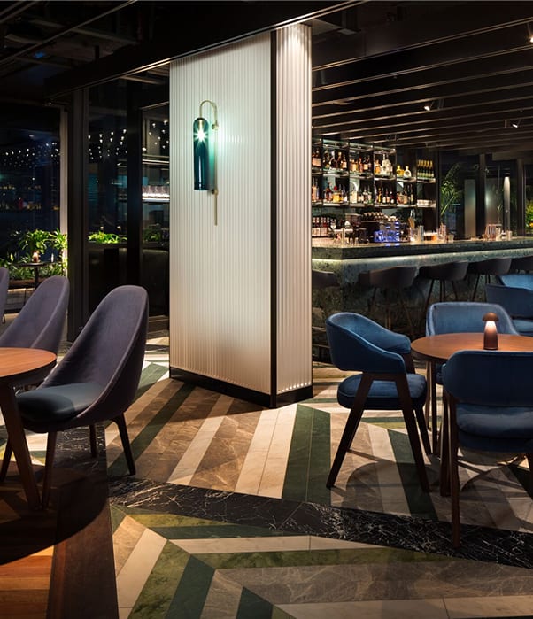 West Hotel’s architectural façade is inspired by the faceted edges of a jewel. Looking through to the interior lobby’s striking graphic floor, gemstone-coloured furniture and bespoke finishes creates an alluring spectacle. Step in and be dazzled by West Hotel’s edgy sophistication.